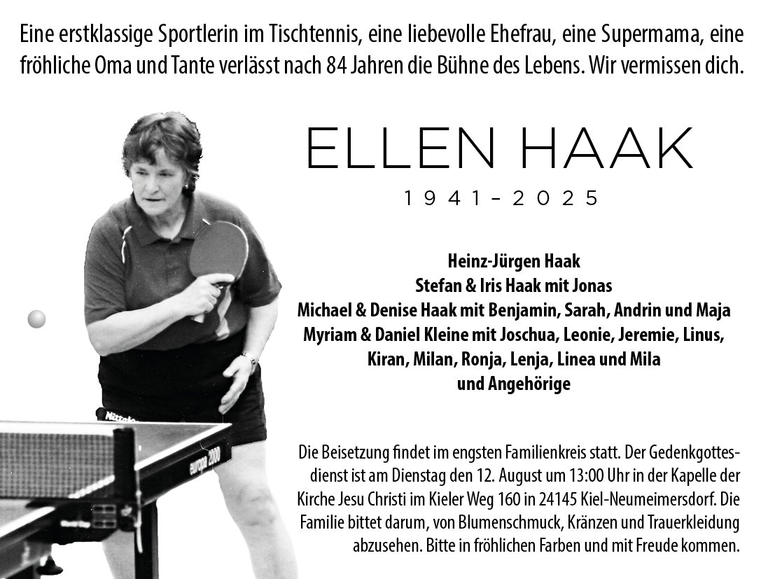 Meine liebe Ehefrau Ellen hatte einen schweren Schlaganfall erlitten, musste noch kurz nach der Einlieferung notoperiert werden, aber obwohl sie überlebt hat, sind die Folgen zu schwer gewesen, als dass sie sich davon erholen konnte. Ein paar Tage nach dem Schlaganfall schlief sie friedlich im Alter von 84 Jahren im Krankenhaus in Rendsburg ein. Die Familie konnte sich noch von ihr verabschieden und es waren schöne Momente. Wir vermissen ihre fröhliche Natur und ihre liebevolle und lebendige Art.